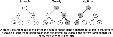 첫 번째 그림과 같은 그래프가 있을 때, 거쳐가는 모든 값의 최댓값을 만든다고 한다면 정답은 Optimal 부분의 0 → 3 → 100 일 것이다. 하지만 그리디 알고리즘을 사용한다면 현재 위치에서의 최선의 선택을 하기 때문에 0의 위치에서는 3과 10 중에 10이 더 크므로 10으로 이동하고 10의 위치에서는 7과 8 중에 8이 더 크므로 8로 이동할 것이다. 즉, 그리디 알고리즘을 사용하면 0 → 10 → 8 Greedy 부분처럼 이동할 것이다.