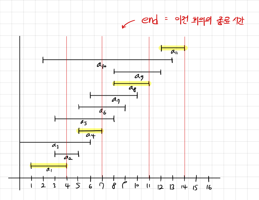 가장 빨리 끝나는 것은 a1이므로 첫 번째로 a1을 선택하고 a1의 종료 시간을 end에 저장한다. 그리고 end와 이후의 회의 시간의 시작 시간을 바교하여 end <= 회의 시작 시간 중 가장 먼저 있는 회의 시간인 a4를 선택한다. 이 과정을 반복하면 a1 → a4 → a8 → a11이 선택되므로 최대 회의 가능한 수는 4가 된다.