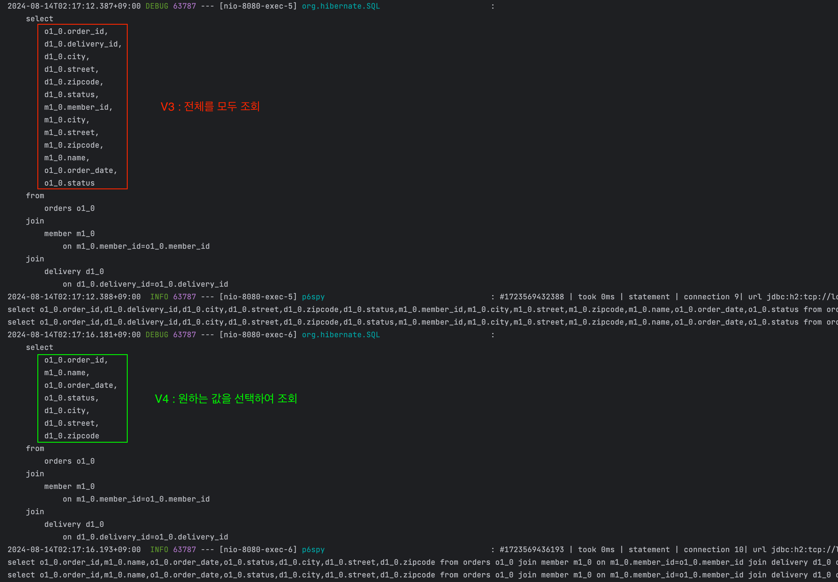 V3와 V4를 실행했을 때, 모두 쿼리가 한 번 나가지만 SELECT 부분을 보면 V3은 Order의 모든 값을 SELECT 하지만, V4의 경우에는 SELECT 부분에서 DTO에 필요한 부분만 SELECT 하였다.